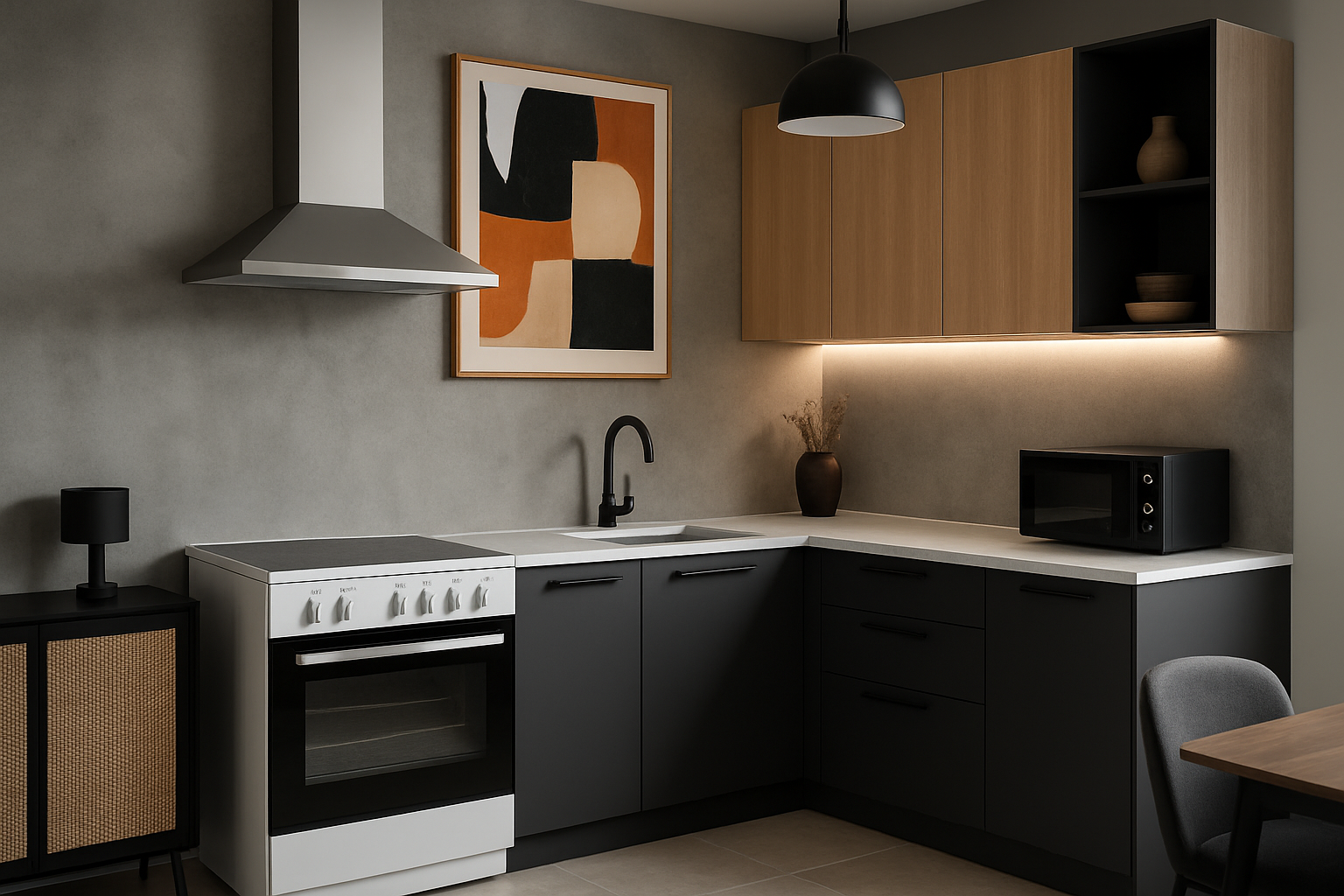Minimalist capsule wardrobe closet design showcasing modular storage units, hidden compartments, a fold-out ironing boar...